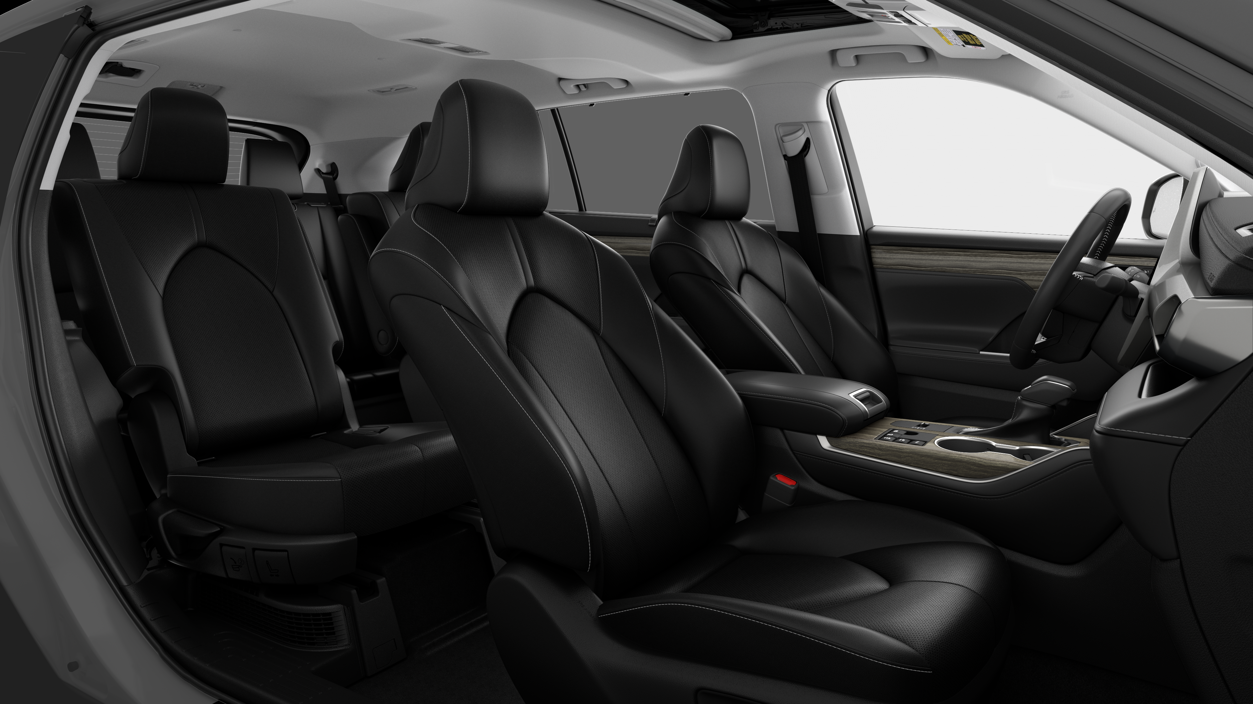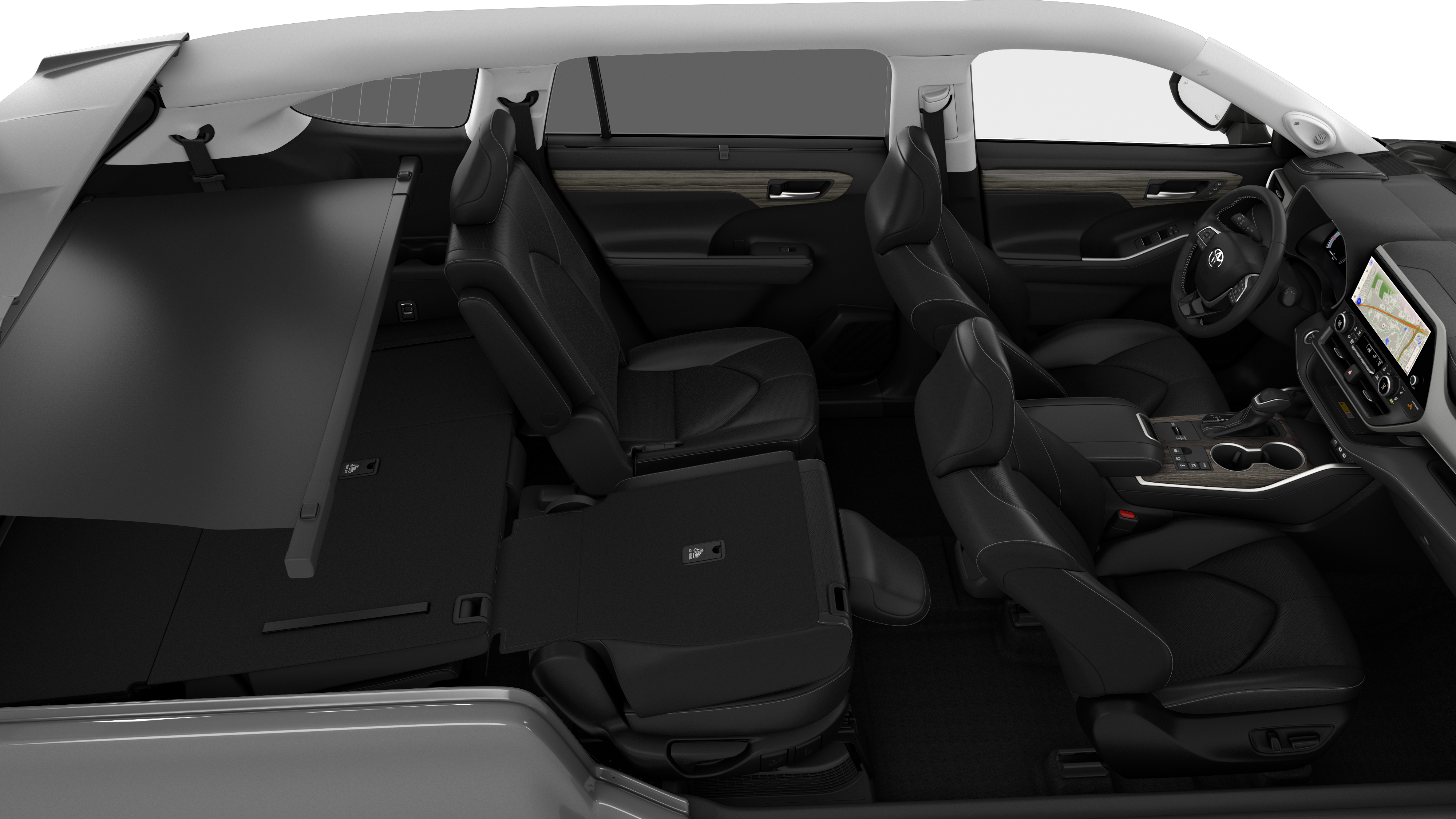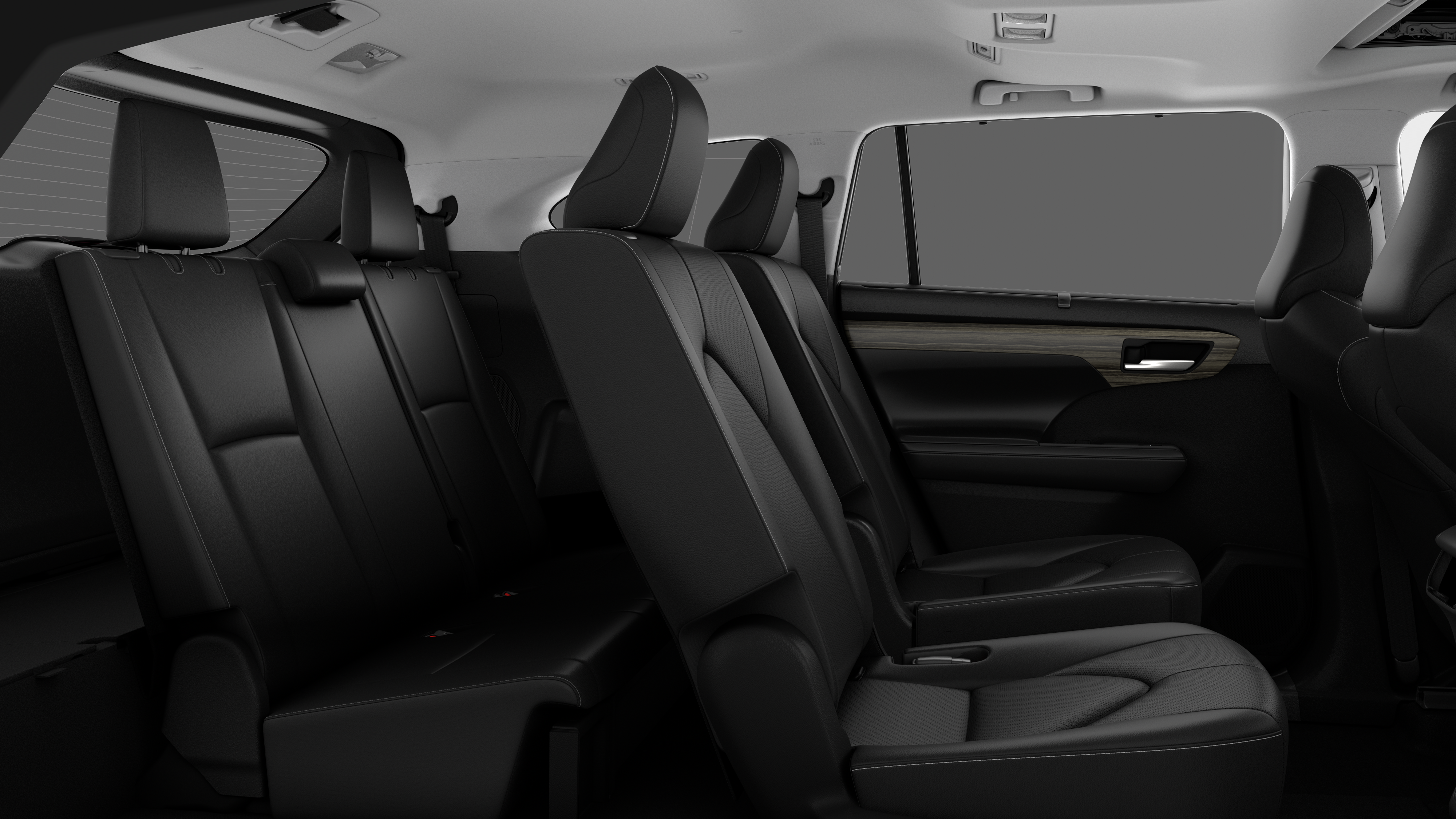 - 7-passenger seating with second-row fold-down captain's chairs and fold-down inboard armrests, adjustable headrests and two cup holders mounted on the floor; and 60/40 split, fold-flat third-row seats with sliding headrests and recline function